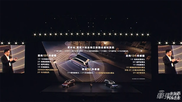 智能驾驶能力方面,新车搭载四颗激光雷达,包括前向192线激光雷达、侧向和后向高精度固态激光雷达,前向一共有15个传感器,侧向8个传感器,后向也有13个传感器,全车一共36个传感器,硬件上基本为L3座好了准备。