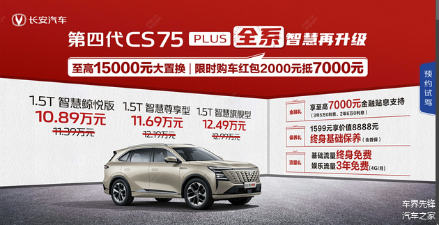 目前,长安 CS75 PLUS 1.5T 鲸悦版提供了最新政策权益。置换直降1万5+金融0利息,4S店销售都喊离谱。保养方面,1599 元即可享价值 8888 元的保养套餐,包含终身基础保养(含首保)。流量福利方面,基础流量终身免费,娱乐流量 3 年免费(4G/月)。特别是2000元抵7000元,限时红包一叠,裸车价压到10.89万起。