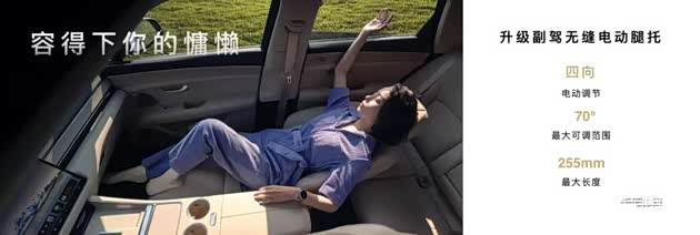 内饰新增赤茶橘配色,温暖柔和又不失热情。同时升级副驾,有最大角度70°的无缝四向电动腿托和可调色温化妆镜,全系车型标配座椅通风、加热和按摩功能。