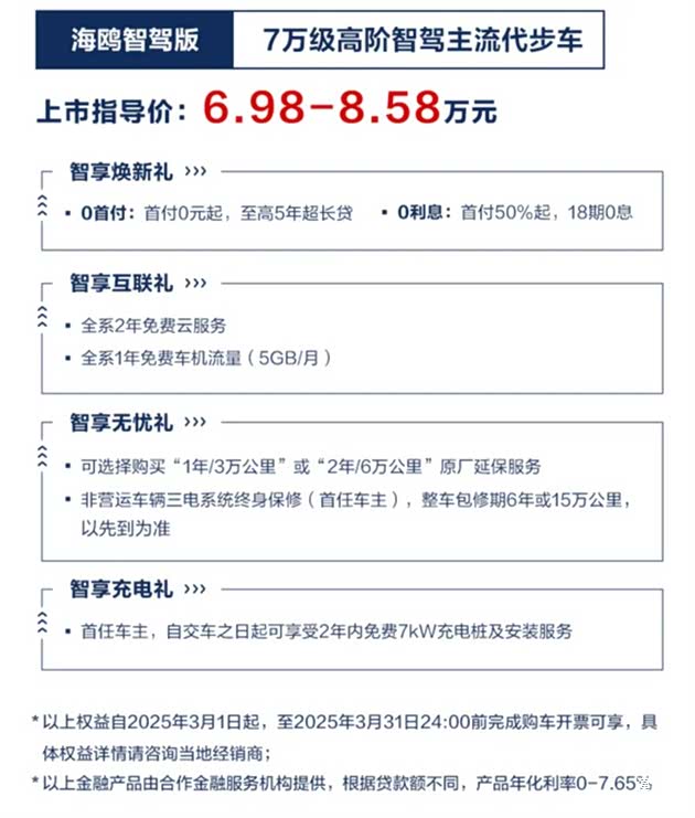 海鸥:官方价6.98万-8.58万,但优惠较少,虽也有免息政策,但需要首付50%以上才能享受18期免息。