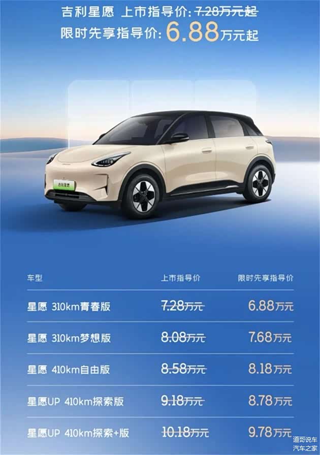 星愿:6.88万-9.78万指导价,叠加5万24期0息+2万置换补贴后,实际起售价跌破6万。