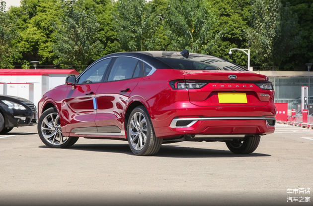 蒙迪欧的车侧保持了溜背式的轿跑化设计,但相对修长的车身和厚重的车门和头尾部设计也并没有让其看起来过于动感。车顶区域采用了熏黑涂装,并配有镀铬的窗边饰条,形成了一定的悬浮式效果,腰身区域采用了前中后相互错落的横向筋线结构,车门下方区域带有微微的内凹处理,加上单独的裙边饰条装饰,也让视觉感保持紧致。车尾则引入了贯穿式尾灯组,两侧纵向的灯带结构致敬了“MUSTANG”的设计语言。