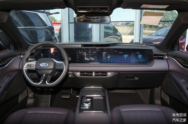 除了混动总成的加入之外,这一代蒙迪欧的变化集中在内饰上,车内采用了环抱式的星际座舱理念,主副驾区域根据车型采用了不同的交互设计,高配车型均采用12.3英寸液晶仪表+27英寸中控和副驾联屏的组合,带来了一体式的科技化交互体验。车内用料以软性的皮质包覆为主,整体偏暗色系的搭配和细节处的镀铬饰条装饰也延续了美式车型相对稳重豪华的风格。