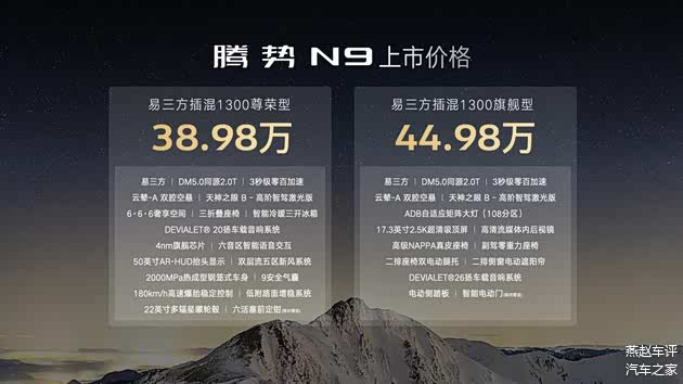 2025 年 3 月 21 日,腾势 N9 作为科技安全全能旗舰 SUV 震撼登场,以科技致敬奋斗者时代。此次推出易三方插混 1300 尊荣型与旗舰型,官方指导价 38.98 万 - 44.98 万元。该车凭借科技重构旗舰,全系标配易三方、2.0T 超级混动、云辇 - A(双腔空气悬架)、天神之眼 B,重塑 50 万级大型旗舰 SUV 价值标准,开启科技豪华 SUV 新篇。