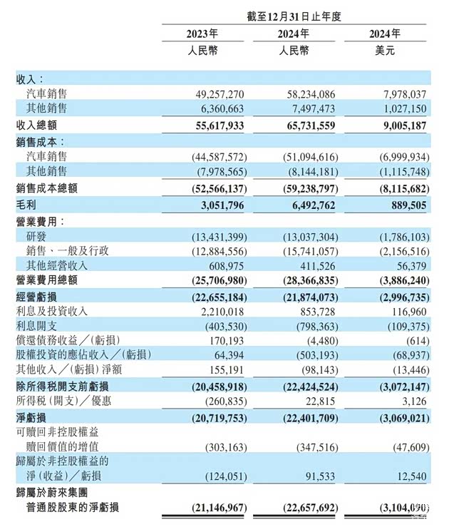 在三费支出方面,2024年蔚来全年的研发费用为130.373亿元,同比下降2.9%。这主要与研发职能的人员成本下降,新产品、新技术在不同开发阶段所带来的设计和开发费用下降有关。销售、一般及行政费用为157.411亿元,同比增长22.2%,这与新品牌及新产品相关的销售及营销活动增加,以及销售及服务网络扩张相关的人员成本增加等因素有关。