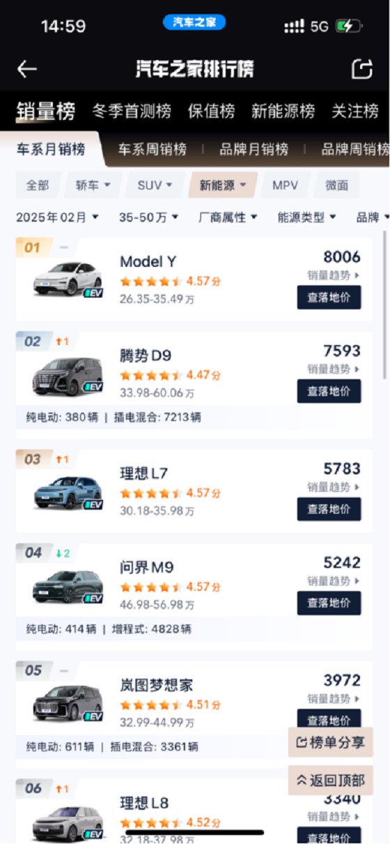 从汽车之家 2025 年 2 月销量数据看,腾势 D9 以 7593 辆稳居新能源销量榜前列,其中插电混动车型销量达 7213 辆,占比超 95%。这一数据不仅展现了腾势 D9 在插混 MPV 领域的统治力,更折射出行业趋势:插混车型因续航灵活、油耗经济,正成为高端 MPV 用户优选。