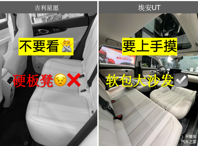 对于家庭用户来说,内饰的材质直接决定了日常用车的舒适度。埃安UT在内饰用料上可谓诚意满满,座椅采用了豪华皮质,触感细腻柔软,填充物支撑性很好,长时间驾驶也不会感到疲劳。同时,软包皮质的设计也提升了内饰的整体档次感,给人一种高级车的体验。而星愿UP的座椅材质则采用的是仿皮,虽然也算柔软,但仿皮的味道偏大,塑料感较强,手感上和档次感上相比埃安UT还是有所差距。尤其是对于有娃家庭来说,仿皮材质在夏天容易产生异味,长时间乘坐可能会让人感到不适。