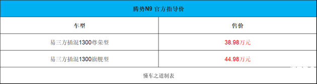 3月21日,腾势旗下全新旗舰SUV--腾势N9 正式上市,共推出2款车型,售价38.98-44.98万元,新车搭载易三方技术,天神之眼B-高阶智驾激光版(DiPilot300)、云辇-A(双腔空气弹簧)、帝瓦雷剧院级声场等配置。动力方面,腾势N9搭载易三方技术,配备插混专用2.0T高效发动机+680kW前后三电机,零百加速仅需3.9s,同时它支持后轮转向,圆规调头、蟹行模式等特有功能。此外,腾势N9还搭载云辇-A(双腔空悬)+预瞄系统,能提前调整悬架软硬。续航方面,插混版腾势N9电池容量约为47kW·h,能实现200km的纯电续航,综合续航能超过1300km。