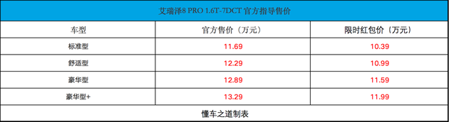 近日,奇瑞艾瑞泽8 PRO正式发布上市,共推4款车型,官方售价区间为11.69-13.29万元,限时红包价区间为10.39-11.99万元。动力方面,根据规划奇瑞艾瑞泽8 PRO提供1.6T与2.0T两款发动机,此次发布车型搭载1.6T发动机最大功率为145kW,最大扭矩为290N·m,匹配7挡双离合变速箱。5月推出搭载2.0T动力版本2.0T发动机最大功率为187kW,最大扭矩为390N·m。《一周新车》栏目作为《懂车之道》全新一档新车栏目,期望能为大家的阅读和了解最新新车带来更多帮助。(图/文:懂车之道 李玲 编辑)