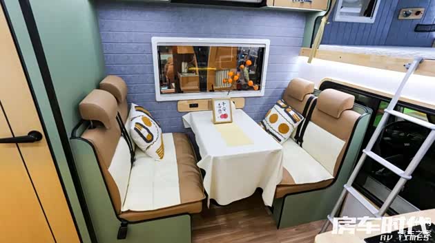 生活区采用了原木纹+云岫绿的内饰配色,整体清新雅致,颜值较高。会客区为经典的对卡座布局,中部设置有升降桌面,整个区域能够在驻车状态下拼床使用。