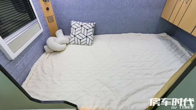 车辆尾部为固定睡卧横床,标配高弹床垫,柔软舒适,区域内还为用户配置了可调节万向阅读灯以及电源接口等便利性设施,贴心实用。床铺上方还做了储物柜的设计,便于用户收纳生活衣物。