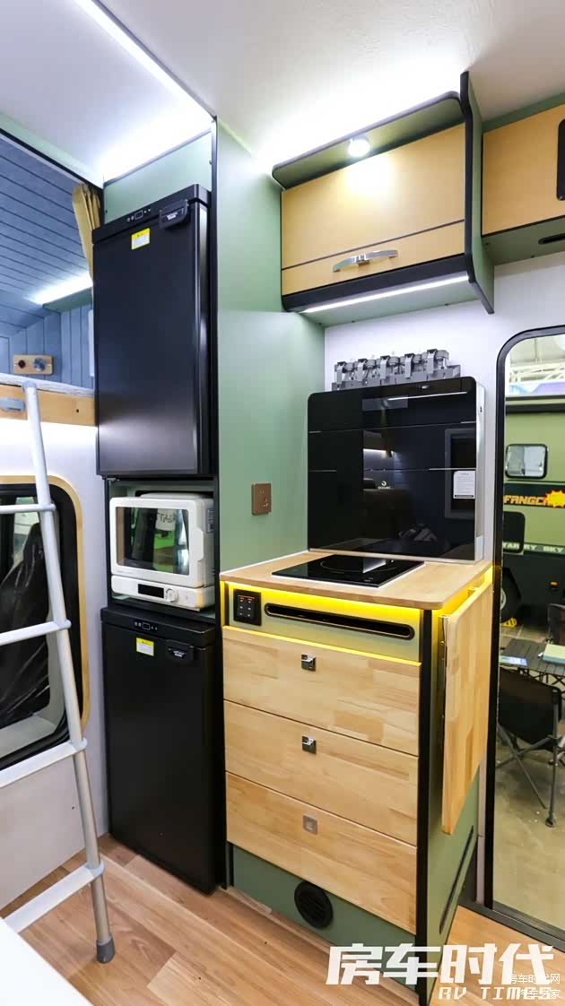 新车采用全铝板箱体和铝合金龙骨结构,四明治复合箱体保障了良好的保温降噪性能。车身外侧配置了电动双级踏步、4.2×2.5m外置遮阳棚、LED灯带等实用附件以及防水外接电源接口、新能源充电口等充能设施,功能丰富实用,车辆尾部还提供了一个空间较大的贯通式储物箱,便于用户收纳行李物品。