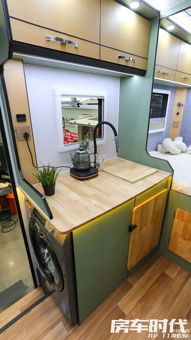 卫浴间为干湿一体式设计,内部配备赛特福德可旋转马桶、多功能淋浴花洒、一体式房车专用水盆、浴室镜及侧排换气扇,卫浴功能齐全,房车内部还为用户配置了一台8kg全自动洗衣机,大容量设计能够随车清洗大件衣物,实用便捷。