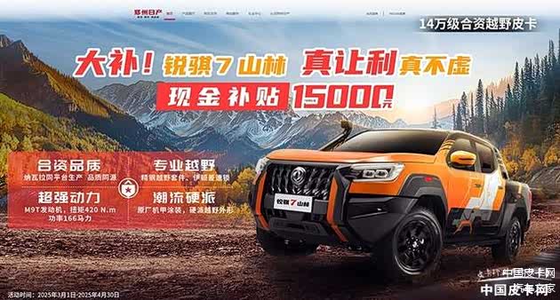 基于锐骐7柴油四驱车型打造的锐骐7山林版可以说是目前性价比最高的原厂改装越野皮卡,目前官网就打出了售现金补贴1.5万元信息,不过这个优惠促销有时限,从3月1日至4月30日期间可以享受这个优惠政策。