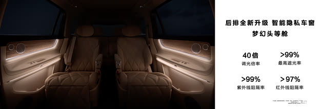 两侧后排升级智能隐私车窗,4档透光度可调,支持多种调节方式。开启暮夜空间,一键就能营造隐私休憩环境。