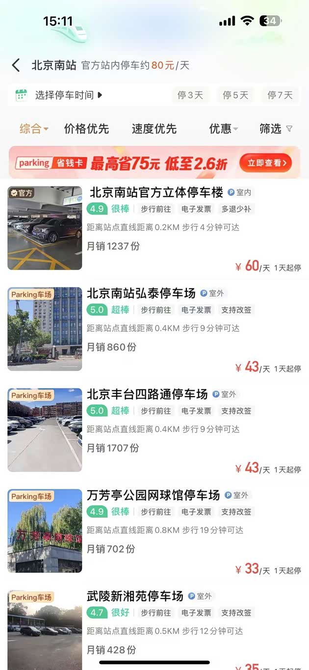 对于不少北京车主而言,开车去北京南站本是方便又自在的选择,然而高昂的停车费却成了大家的心头病。北广场停车场一天收费高达152元,地下停车场更是贵得惊人,一天要260元,这让许多车主叫苦不迭。不过现在有了省钱的好办法。点击下方蓝色链接,即可轻松预约官方和周边的停车场,且输入邀请码“88”,还可领取38元停车抵扣券,让停车更划算。要是选择通过小强停车预订北京南站P1立体停车场,一天仅需60元,相比之前的价格,能省下一大笔钱。要是想进一步节省开支,还可以预订南站周边的其他停车场,一天最低只要33元。这些停车场不仅价格实惠,位置也比较优越,车主们可以根据自身需求灵活挑选,从此告别为高昂停车费发愁的日子。