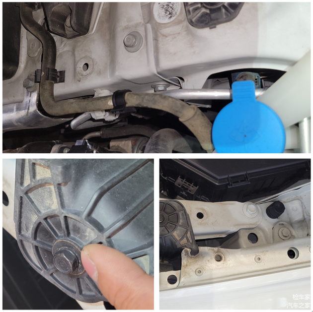 随后打开机盖,把水箱框架上的饰板拆开,框架的固定螺丝没有问题,大灯的螺丝也没有动过,水箱框架以及大灯框架整体没有变形,基本可以确定前面不会有太大的问题。