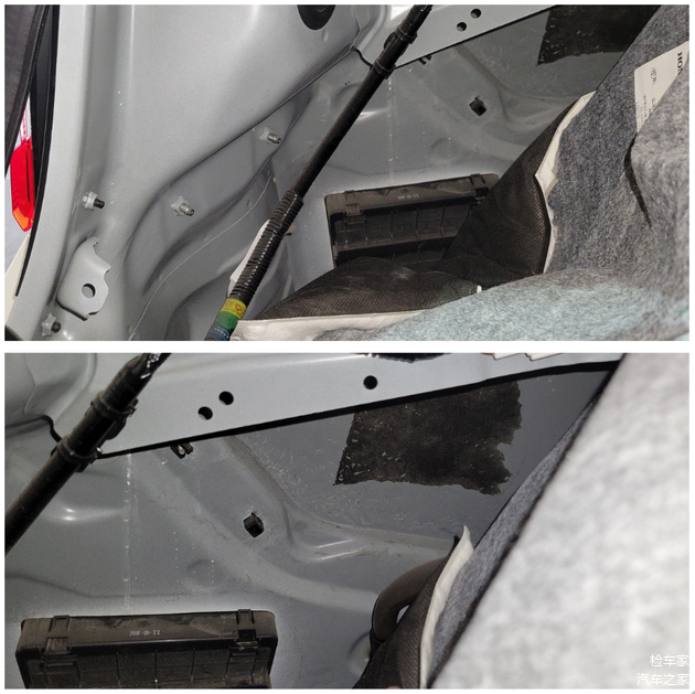 现在看到的这个位置是后备箱左侧里面的情况,拆开后备箱左边的内衬可以看到上面是有修复过的,上面还有很多划痕。看到这种情况我们就不能大意了,周边就一定都要仔细排查,搞不好就会有点问题。