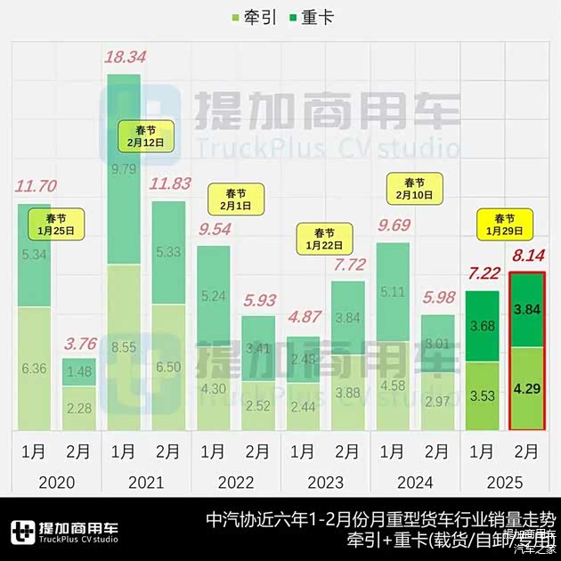 根据中汽协数据统计:2025年2月份重型货车市场销售81363辆,同、环比分别增长12.74%和36.09%而实现连续攀升。考虑到今年春节与2023年均为“1月假期档”,整个1-2月份有效工作日分布均匀,因而在过去六年中表现相对均衡,并取得历史第二好水平,表现出市场端仍具备较强的信心。其中:半挂牵引类销售42917万辆、同比骤增44.72%接近半数;重卡类(载重/自卸/专用类)销售38446辆、同比增长27.59%。累计来看,今年1-2月份重型货车共销售15.35万辆、同比微降2.15%,但在2月份的强力支撑下已呈现回暖势头,其中:牵引和重卡类分别为7.83万辆和7.53万辆,二者份额犬牙交错,前者一举扭转了1月份的颓势,成功夺回“一核”位置,希望能连续保持优势;而后者则落后去年同期近6千辆、“亏空”接近一成,可知市场端仍需努力。