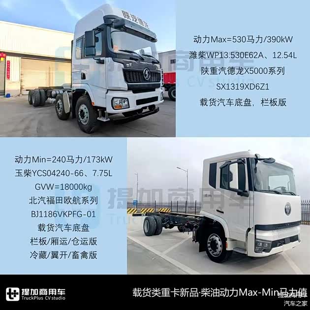 载货类柴油动力Max=530马力/390kW,即潍柴12.54L的WP13.530E62A柴油机,由陕重汽SX1319XD6Z1载货汽车底盘及栏板版整车采用,德龙X5000系列驾驶室、准乘2人,可选升级款造型,轴距4575/4425mm,双前桥14片、后12片板簧悬挂,形成整车后厢长9.3/9.4/9.5米,额载16.62/15.37吨、载质量利用系数1.17/1.00,油耗35.3L/100km。