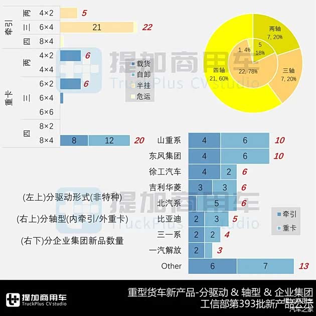 对本批63款重型货车新品进行驱动形式和轴型的细分,主要变化有:1、小三轴全面碾压大三轴,除轿运车外,普货运输同样看重产品经济性;2、自卸类本月期回暖,12款新品均为8×4-BEV动力方案,柴油新品已连续五个月期“失踪”,作为城市车辆的重要品类,“全面电化”的积极影响不容小觑。