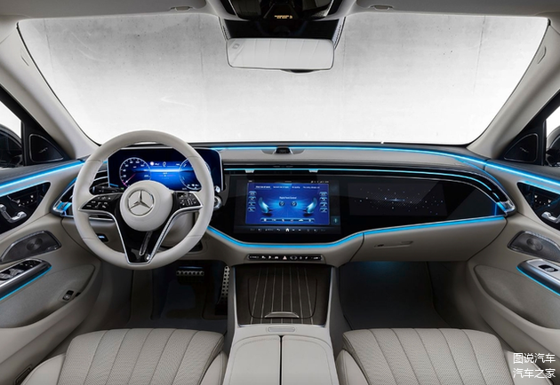 内饰方面,E级中控采用悬浮式大屏,视觉效果震撼。环抱式座舱结合科技感十足的造型以及灯光烘托,显得很有格调和档次。部分豪华车型还配有副驾娱乐屏和抬头显示。