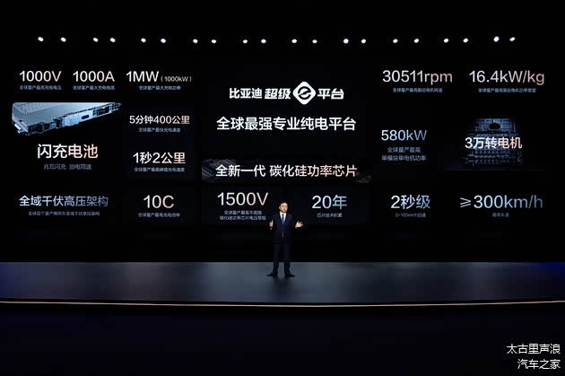 比亚迪发布的超级e平台,是“全域1000伏”,包括电池、电机、电源、空调等都是1000伏,意味着整个电子电器架构运转更快。