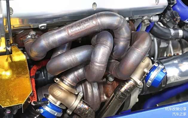 为了让发动机发挥最大潜能,进排气方面进行了对此测试和定制,从而获得更佳的气流效果,节气门采用澳大利亚PLAZMAMAN的67φ型号,涡轮采用双涡流型EFR8374,搭配高强度的EX mani双废气门,兼顾了高低转速的表现。