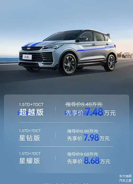 3月25日, 吉利缤越L超越版正式上市,官方指导价8.48万元,限时先享价7.48万元(含1万元现金补贴,有效期至4月30日)。新车可以视为吉利缤越L的全新入门车型,功能配置层面有所调整,提供专属冠军运动选装包。现阶段,吉利缤越L共计可选3款车型,官方指导价格区间为8.48万-9.68万元。