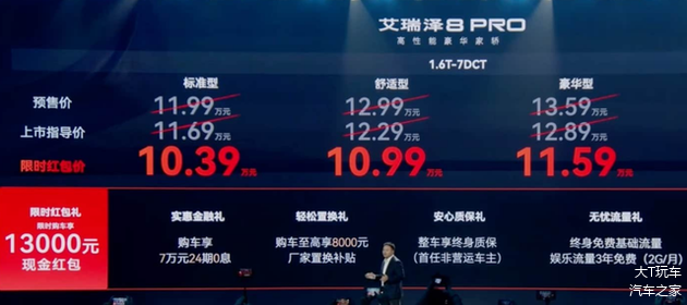 3月22日,奇瑞艾瑞泽8 PRO正式上市,共推出4款车型,上市指导价区间为11.69-13.29万元,限时红包价区间为10.39-11.99万元。