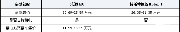 先来从价格方面来看,乐道L60的官方指导价为20.69-25.59万元,还提供租电方案购买,如果选择这一方案的话,价格可以降到14.99万元-16.99万元。再来看特斯拉焕新Model Y,其指导价格区间为26.35-31.35万元之间,可以明显发现,就价格而言,即便乐道L60选择带电池的情况下,特斯拉焕新Model Y的入门版也比乐道L60的顶配车型更贵,因此两款车虽然同为纯电中型SUV,但是就价格来说,乐道L60价格更低。