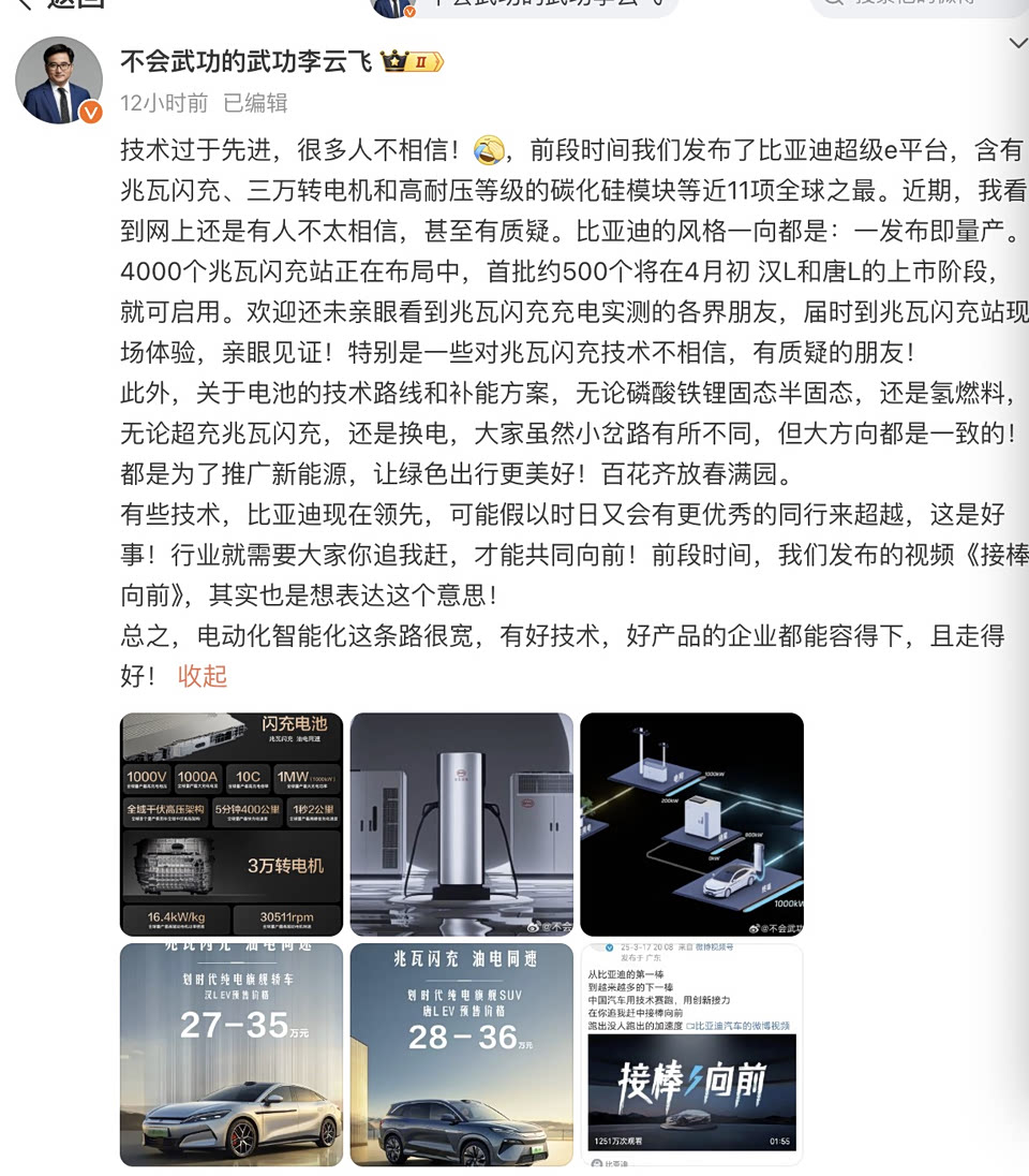 ②首批500个站点将在4月初与汉L/唐L同步落地,开启“车+桩”协同,初期有可能会优先在比亚迪4S店内建设,毕竟体验感与服务性更强,更关键是这很符合比亚迪“一发布即量产”的作风,厚积薄发