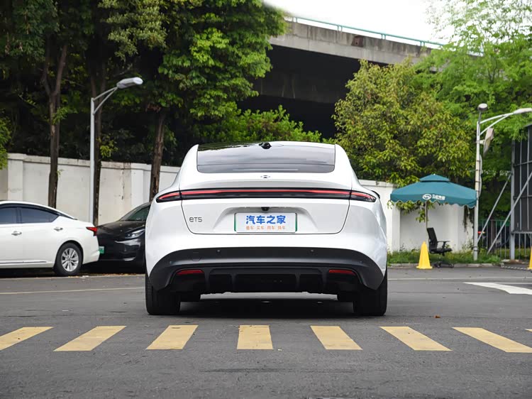 蔚来 ET5 车尾延续溜背轿跑风格,小鸭尾扰流板与贯穿式尾灯组形成视觉焦点,尾灯采用立体熏黑设计,内部光带呈 “C” 型布局,夜间点亮后辨识度较高。后包围通过分层式结构强化运动感,底部黑色扩散器与两侧反光条呼应,配合无框车门及 19 英寸五辐轮毂(轮胎规格 245/45 R19),整体营造出宽体低趴的姿态。车身尺寸为 4790×1960×1499mm,轴距 2888mm,行李厢容积 386-1135L,兼顾实用性与轿跑造型特征。