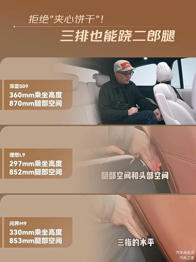 深蓝 S09 以其出色的性能,让长辈陶醉其中。870mm 的腿部空间让长辈尽情舒展双腿,360mm 的坐高让头部畅快呼吸。1300mm 的通道高度保障了出行的顺畅。4.3㎡纯平地板面积带来宽敞的乘坐体验。