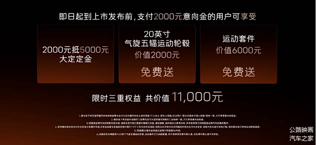 阿维塔06现已开启预售,即日起到上市发布前,支付2000元意向金的用户可享受限时三重权益,包括2000元抵5000元大定定金;免费赠送价值2000元的20英寸气旋五辐运动轮毂;免费赠送价值6000元的运动套件,三重权益共价值11000元。