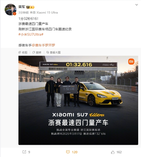 【#小米SU7Ultra成浙赛最速四门量产车# 成绩1分32秒616】 3月28日,#雷军# 发文宣布,小米SU7 Ultra在浙江国际赛车场刷新了四门车圈速纪录,以1分32秒616的成绩成为浙赛最速四门量产车。目前,小米SU7 Ultra已经在成都天府赛道、株洲国际赛道、珠海国际赛车场和上海国际赛车场刷新了四门量产车的最快圈速。(CNMO科技)