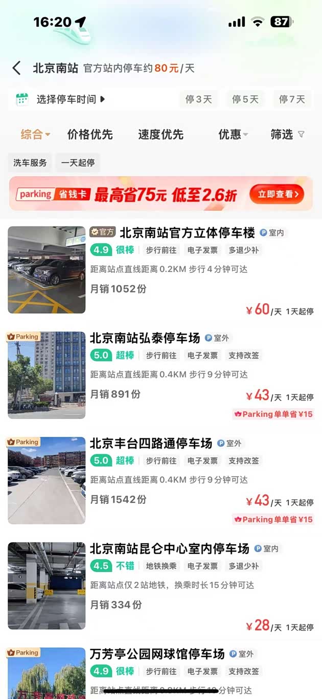 然而,站内停车场的高昂费用却常常让人望而却步。但幸运的是,现在有一个好消息要告诉大家!您只需微信搜索【小强停车】在上面查看附近停车场,你可以轻松在小强停车预约到北京南站的官方立体停车楼,享受仅需60元/天的超值优惠价格。不仅如此,如果你对价格还有更高的要求,南站周边也有许多价格实惠的停车场供你选择。这些停车场不仅位置便捷,而且收费低廉,最低仅需28元/天。输入邀请码“58”,还可领取38元停车抵扣券!无论是商务出差还是旅游观光,都能让你更加省心、省力、省钱。