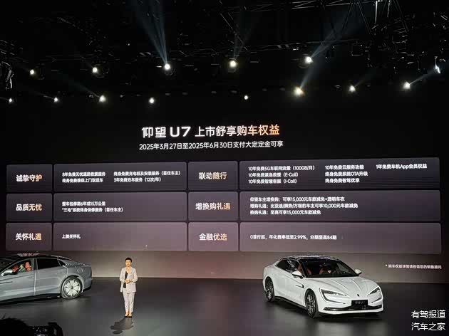 发布会期间,官方还推出了上市舒享购车权益。其中包括诚挚守护:8年免费无忧道路救援服务、终身免费充电桩及安装服务(首任车主)、终身免费维保上门取送车、3年免费泊车服务(12次/年);品质无忧:整车保修期6年或15万公里、“三电”系统终身保修服务(首任车主);关怀礼遇:上牌关怀礼;联动随行:10年免费5G车联网流量(100GB/月)、10年免费云服务功能、1年免费车机APP会员权益、10年免费紧急救援、10年免费智慧客服、终身免费系统OTA升级、终身免费智驾优享;增换购礼遇:仰望车主增换购:可享15000元的车款减免+透明车衣、增购礼遇:比亚迪/腾势/方程豹车主可享10000元车款减免、增购礼遇:至高可享15000元车款减免;金融优选:0首付起,年化费率低至2.99%,分期至高84期。