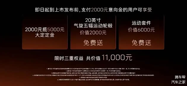 预售期间,支付2000元意向金的用户可获得总价值11000元的三项限时权益,包括订金膨胀、轮毂及运动套件赠送。