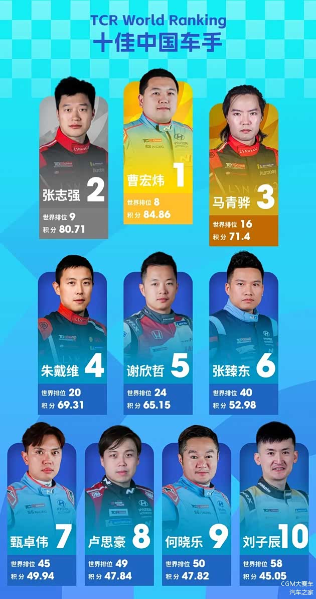 从其他热门体育赛事汲取灵感,TCR世界排名系统同时也是一套滚动更新榜单。每周三是这套系统刷新排名的时间节点,针对这一节点前的近20场比赛的结果才会纳入核算,早期的比赛结果将随时间推移被逐步移除,唯有持续参赛并获取佳绩才能确保在榜单上成为常青树。接下来我们就将盘点TCR世界排名前十的中国车手,看看你最心爱的偶像排名何处。