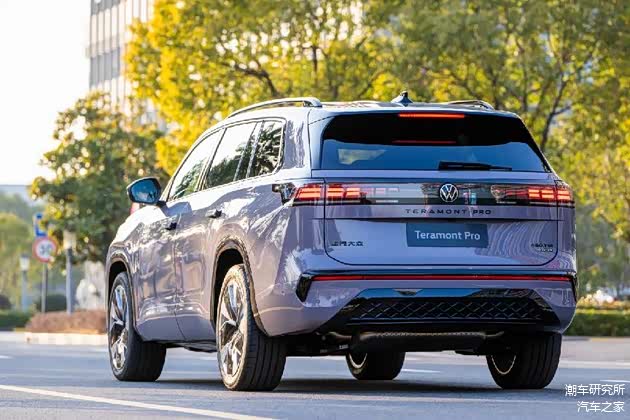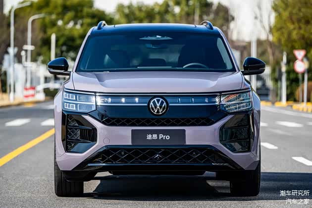 - 首先外观方面,途昂Pro采用全新设计语言,造型运动感十足,车身尺寸宽大。前脸运用大量方形元素,搭配大尺寸进气格栅与大灯组,前脸贯穿灯组配合硬汉造型,妥妥的“赛博硬汉”大气和科技兼备。车身侧面腰线有力量感,采用隐藏式门把手,配备 3 种大尺寸低风阻轮圈,可选择黑曜套件,对车窗包围、B 柱、C 柱进行高光包黑处理。车尾采用贯穿式尾灯设计,后包围有贯穿式反光条,整体辨识度比较高。