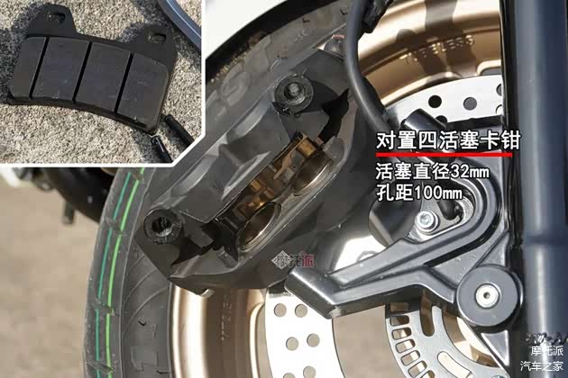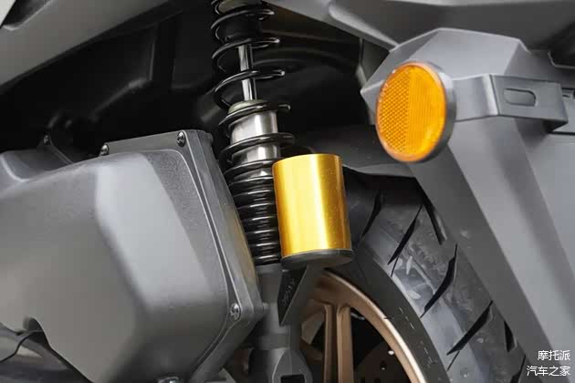 前轮辐射式对向四活塞卡钳,后轮对向双活塞卡钳,从刹车盘面咬合深度可以看出活塞直径不小,前刹车盘直径265mm、后刹车盘240mm。手感拉力适中,在前段就有比较强的制动效果,但后段的精准度不是特别清晰,最大制动力也稍显不足。总体来说,优于给了对四卡钳却活塞直径与刹车盘尺寸不匹配的国产阿普利亚们。