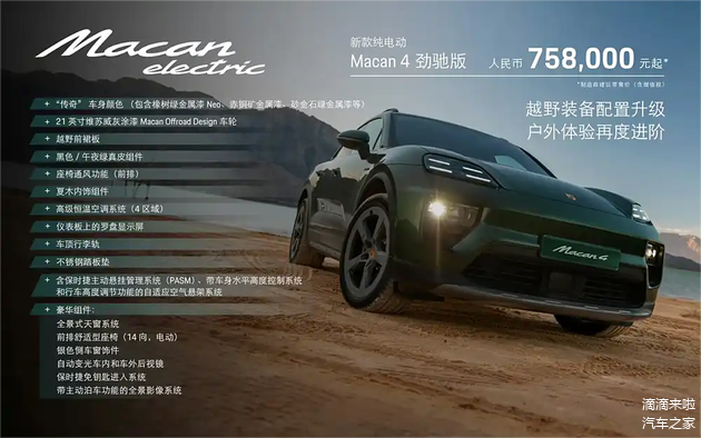 近日,保时捷纯电家族再添实力选手——Macan 4劲驰版正式登陆中国市场!新车售价75.80万元起。作为Macan EV车系的入门车型,新车以更亲民的价格、更高效的续航和纯正的保时捷驾控基因,为追求品牌与实用性的用户提供了全新选择。