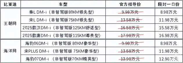 比亚迪王朝网官宣,4款非智驾版热销车型,秦L DM-i(非智驾版)限时一口价8.98万元起,宋L DM-i(非智驾版)限时一口价11.98万元起,2025款汉DM-i(非智驾版)限时一口价15.58万元起,2025款唐DM-i(非智驾版)限时一口价16.98万元起。