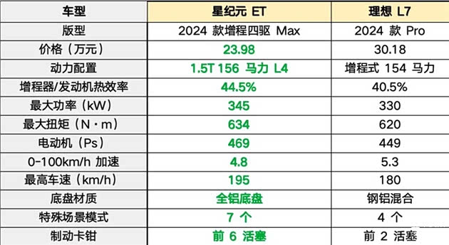 全新星纪元ET增程四驱车型所搭载的“黄金增程”动力系统,在动力性能、能效表现、动力安全、电磁指数以及噪声等级等五个关键维度上,顺利通过了中汽中心新能源检验中心的“Premium Drive高品质增程”技术验证,成为行业内首个获此殊荣的增程动力系统。相比之下,尽管 理想L7作为一款备受瞩目的新能源SUV,自身也具备诸多亮点,但在续航能力、油耗水平以及补能效率等核心指标上,星纪元ET已然展现出更强的竞争力,给理想L7带来了一定的挑战。接下来,我们将通过深入对比,一探这两款车型究竟谁更胜一筹。
