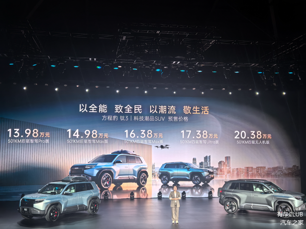 3月31日,方程豹汽车在深圳以“一反常钛”为主题揭开了旗下全新紧凑型SUV 钛3的预售帷幕,这款融合硬派基因与未来科技的新能源车型以13.98万元至20.38万元的价格区间覆盖五款配置,计划于4月正式投入市场。新车全系标配天神之眼C智能驾驶系统,在CLTC工况下均实现501公里纯电续航,其中入门款后驱智驾Pro版以13.98万元起售,而顶配四驱无人机版则通过车载无人机系统等创新配置将价格推至20.38万元。
