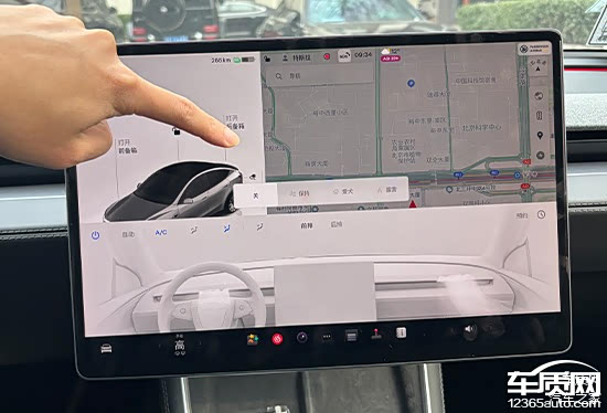 评测车的车机系统界面设计十分简洁,与大多数新能源车型不同,并未提供可更换的壁纸,而是以车辆3D效果图及部分车控功能作为主界面。用户可通过滑动操作收起主界面,右侧分屏显示地图、设置等相关内容。