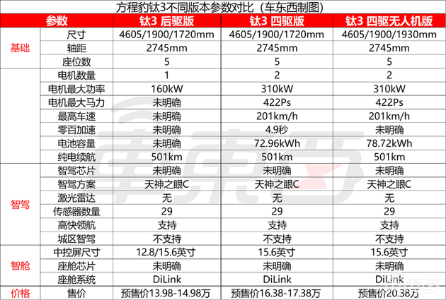 ▲方程豹钛3不同版本参数对比