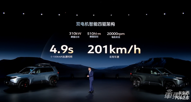 新车基于全新EVO+平台打造,可选双电机四驱系统,前交流异步电机最大功率为110kW,后永磁同步电机最大功率为200kW,系统总峰值功率为310kW,峰值扭矩为510N·m,零百加速时间为4.9秒,最高车速可达201km/h。
