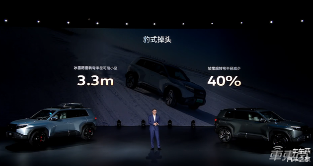 此外,新车还搭载豹式掉头功能,在雪地这种低幅度路面,它的转弯半径缩小至3.3米,比常规转弯半径减小了40%。
